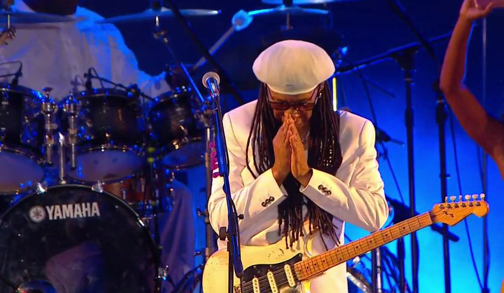 Não faltaram clássicos: “Dance, Dance, Dance”, “We Are Family”, “Like a Virgin” (Madonna), “Let’s Dance” (David Bowie) e “Le Freak”. O público dançava e interagia como ainda não tinha acontecido no Sunset nesta edição. Antes de cantar “Get Lucky”, parceria sua com Daft Punk e Pharrell Williams, Nile falou sobre sua luta contra o câncer e pediu orações à amiga Lady Gaga, que apareceu em uma foto no telão: