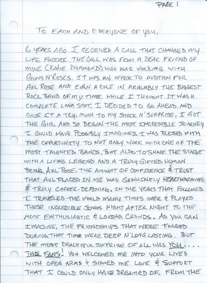 – É com o coração pesado e também com grande orgulho que anuncio que decidi encerrar este capítulo da minha vida e fechar o período maravilhoso que passei com o Guns N’ Roses com boas lembranças – disse através de uma carta divulgada nas redes sociais, escrita de próprio punho.