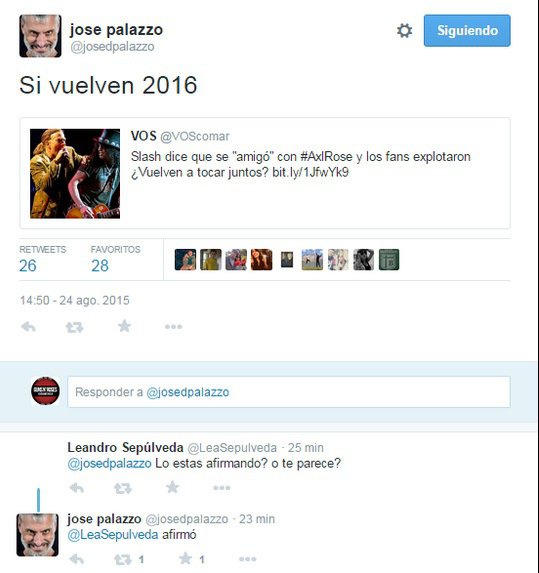 O empresário argentino José Palazzo causou alvoroço nas redes sociais nesta segunda-feira, 24. De acordo com ele, Axl Rose e Slash vão se reunir em 2016. José produziu os shows do Guns N’ Roses na cidade de Córdoba, na Argentina, em 2011, e do guitarrista britânico e sua banda, Myles Kennedy e The Conspirators, no mesmo local.