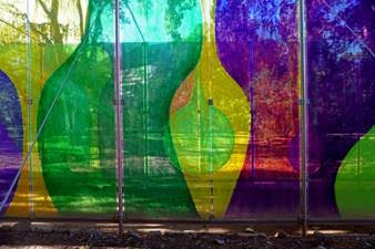 Luminosidade, transparência, forma e cor interagem com a natureza exuberante do jardim centenário. Obra penetrável* conta com 27 metros de extensão