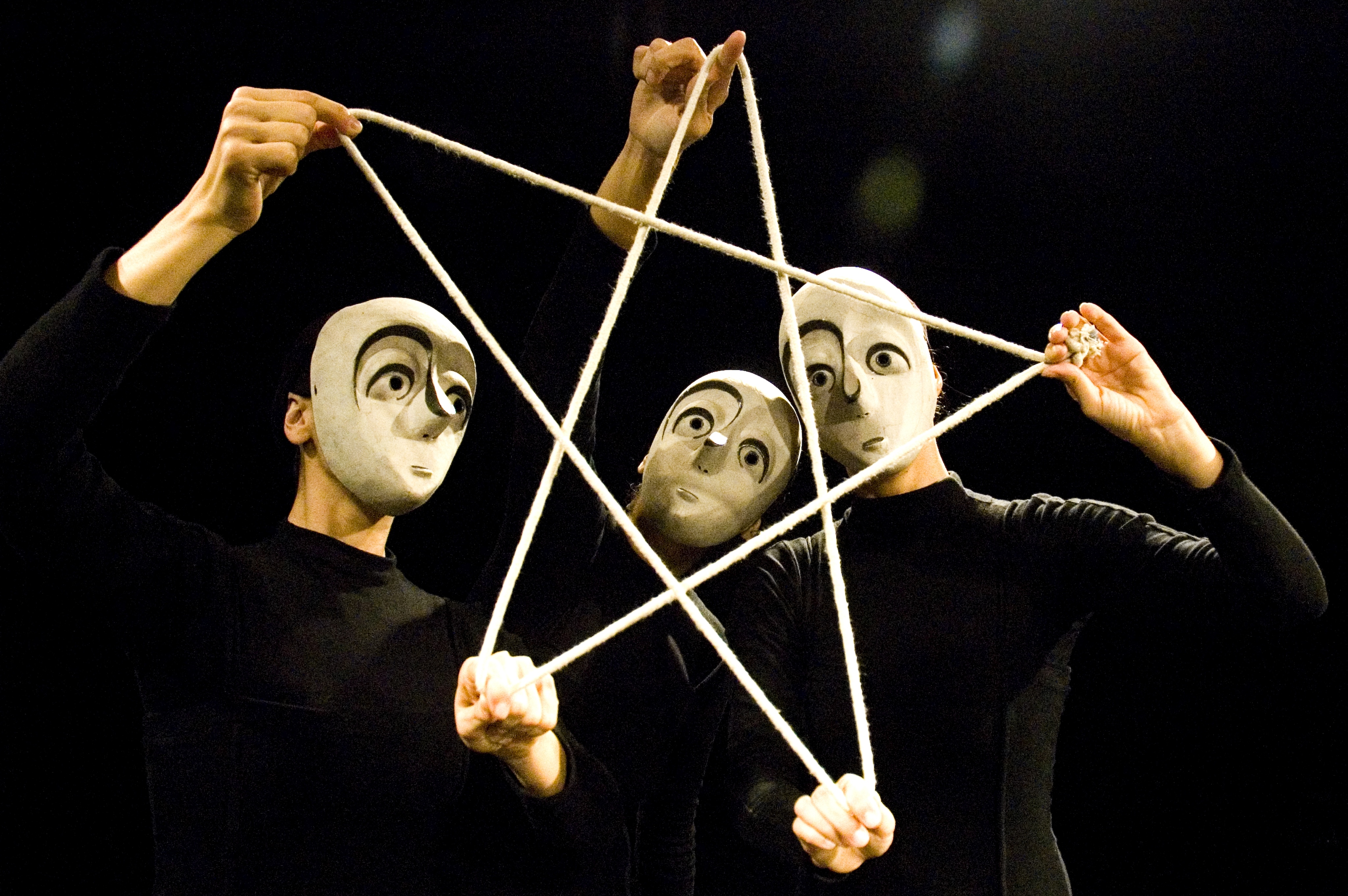 SER E NÃO SER, EIS A QUESTÃO – No palco, objetos, máscaras e bonecos ganham vida nas mãos dos atores Flávia Reis, Julia Schaeffer e Guilherme Miranda.Como o nome já diz, o espetáculo é dividido em dois momentos: no primeiro, os atores transformam-se em divertidos personagens de máscaras que manipulam um fio de algodão. Como numa imensa “cama-de-gato”, seus movimentos com o fio criam diversas formas e situações que surpreendem eencantam a plateia. No segundo número, um boneco sai de dentro de caixas coloridas para conhecer seus manipuladores e desvendar o mundo ao seu redor. Ascaixas se transformam em cenários onde ele vive suas aventuras.