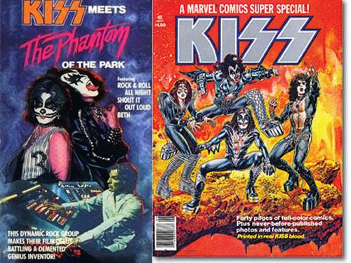 Depois de fazer uma participação especial em uma edição de “Howard, the duck”, os membros do Kiss ganharam sua própria HQ, publicada pela gigante Marvel Comics, no papel de super-heróis. Graças ao estilo extravagante da banda, não foi difícil “cartunizar” Gene Simmons, Paul Stanley, Ace Frehley e Peter Criss. Mesmo assim, o quarteto ofereceu o próprio sangue para sua primeira revistinha em quadrinhos, e isso não é força da expressão. Para fazer das vendas um sucesso, e polemizar também, é claro, os músicos misturaram amostras de seu sangue à tinta usada para imprimir as páginas coloridas. O processo teve até um funcionário público como testemunha para dar aos fãs da banda a certeza de que estavam comprando um pouco do DNA de seus ídolos.