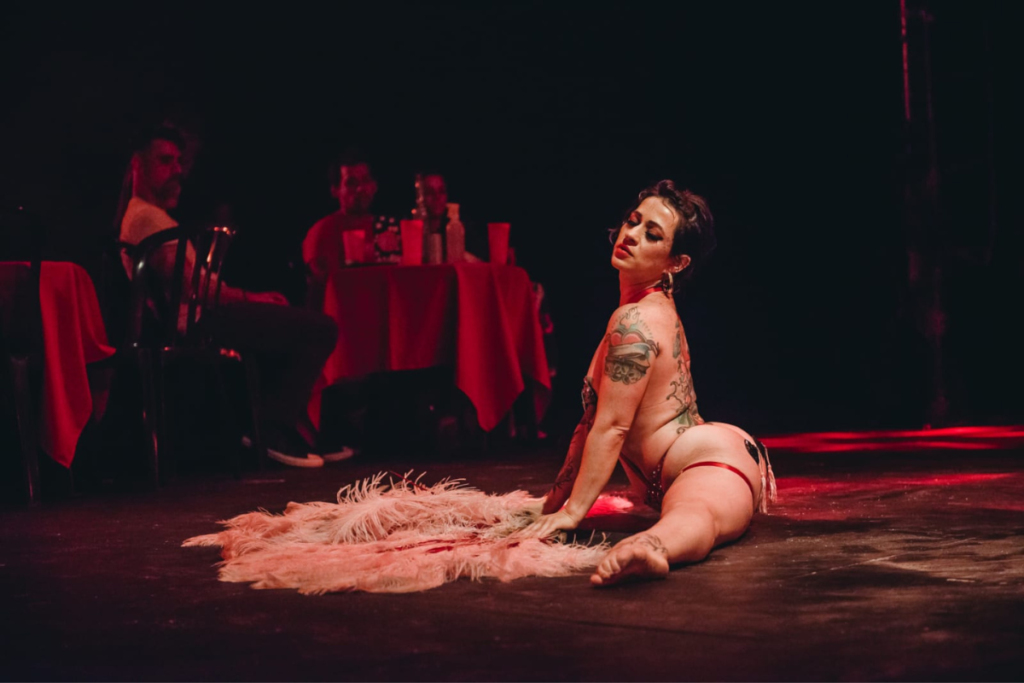 O Cabaré Carioca traz o paradoxo da dança clássica com o neoburlesco e seus potentes leques de plumas – e Rouge Columbine – burlesca, atriz e professora, que traz toda sua potência mãe proletária suburbana para os palcos.