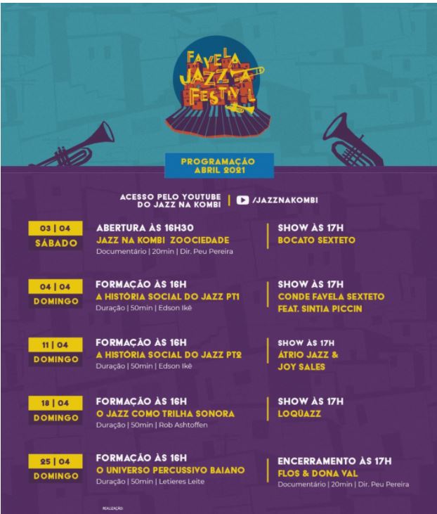 Levando o jazz para seu lugar de origem, o gueto, o Favela Jazz Festival é uma experiência audiovisual em forma de um evento gratuito e online que visa a entreter, divertir, informar e trazer conteúdos que permitam o aprofundamento no contato, vivência e reflexões acerca desse gênero que ainda é visto com muito elitismo. A partir do dia 03/04, em datas não-consecutivas, serão exibidos shows, filmes e cursos no site www.jazznakombi.com.br/favelajazzfestival.