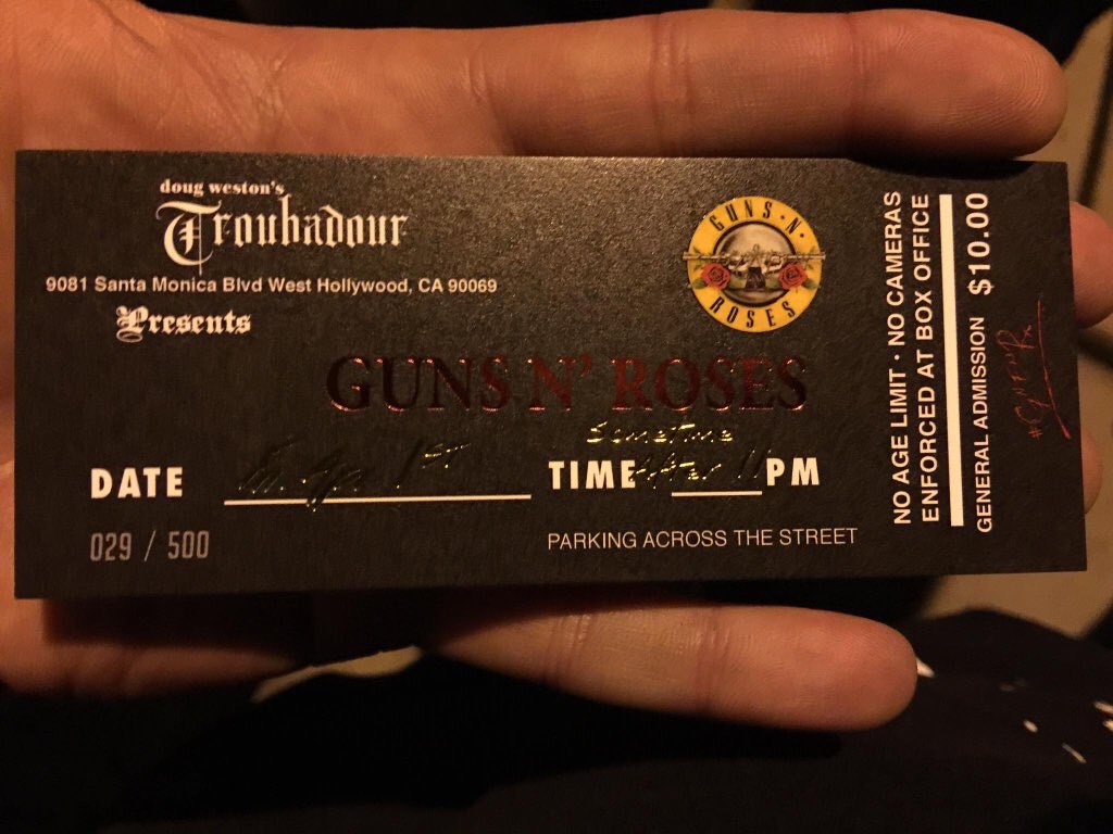 O show foi marcado de forma inesperada propositalmente. Segundo a imprensa americana, a intenção era acabar com o suspense. Através do Facebook, sem nenhum aviso prévio, uma publicação dizia: “Guns N’ Roses in concert!” no Troubadour. Mesmo com muitos achando que seria uma brincadeira de “Primeiro de Abril”, rapidamente centenas de pessoas se aglomeraram no edifício da extinta Tower Records, na tentativa de conseguir uma das disputadas entradas no posto de vendas. Foram colocados à venda apenas 250 ingressos e custavam somente US$ 10 (cerca de R$ 36).