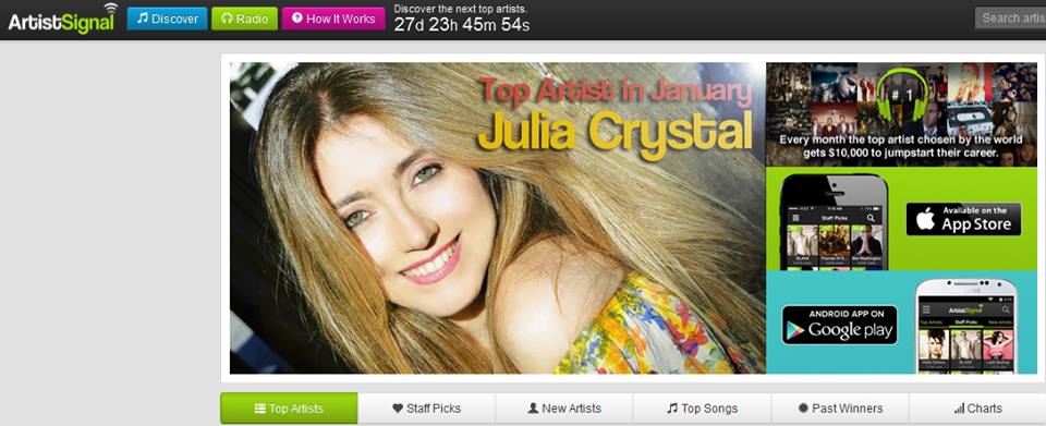 Nesse mês de Janeiro, tivemos a grata surpresa de termos uma cantora carioca como vencedora dessa “Copa do Mundo” de artistas independentes chamada ArtistSignal! JULIA CRYSTAL, que em 2014 lançou o excelente álbum “A Journey to Shamballa” em parceria com o mestre Alex Voorhees (vocalista do lendário grupo de Heavy Metal IMAGO MORTIS e destaque em produções musicais recentes diversas), foi a autora de arrasadora façanha! Um mês antes do lançamento do disco (que saiu no dia 12 de outubro), Julia resolveu participar do processo de votação pelo site. E com o trabalho pouco conhecido (apesar do tempo consistente de carreira), o 33º lugar conquistado foi comemorado como grande feito. E o que dizer de 4 MESES DEPOIS APENAS, Julia Crystal ser vencedora do ArtistSignal entre talentos do MUNDO INTEIRO? É realmente uma trajetória incrível!