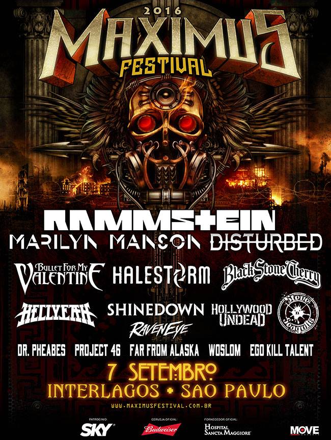 Foi anunciado hoje o line-up do festival Maximus, que será realizado em São Paulo no dia 7 de setembro. Além de Marilyn Manson, estão confirmados nomes como Rammstein, Disturbed e bandas que nos últimos anos tiveram destaque no cenário do rock mundial como Bullet for my valentine, Halestorm, Black Stone Cherry, Hellyeah e Shinedown.