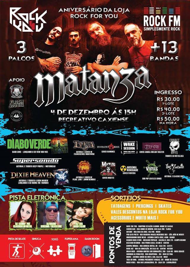 O Matanza volta a Duque de Caxias com a tour ‘Pior Cenário Possível’ dia 04 de dezembro no Clube Recreativo Caxiense. O evento é uma comemoração de aniversário da loja Rock For You e da rádio Rock FM que vem preenchendo um importante espaço na dial carioca após o fim da rádio cidade.