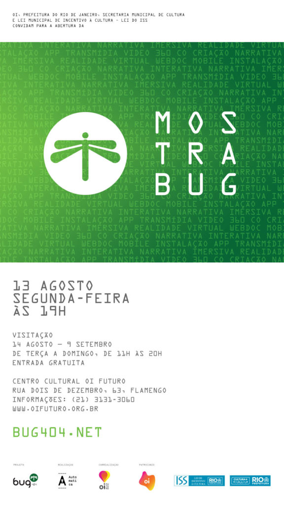 A MOSTRA BUG é uma iniciativa do BUG404 [bug404.net], criado em 2015, como uma rede de pesquisadores e criadores em plataforma digital para apoiar o âmbito transformador das narrativas interativas e imersivas no Brasil, através de ações para o desenvolvimento de projetos e a consolidação de parcerias entre críticos, criadores, produtores e apoiadores.