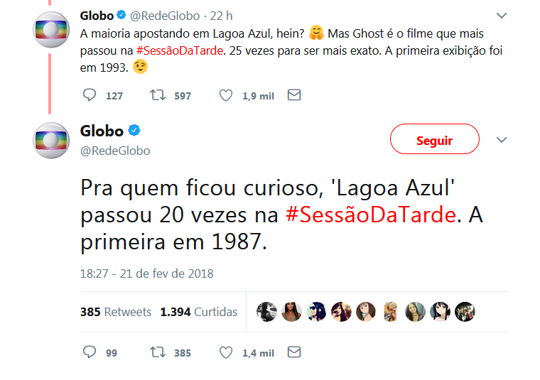 A TV Globo informou o número de exibições após uma brincadeira através da rede social. Perguntada quantas vezes cada filme foi ao ar, muitos apostaram em “A Lagoa Azul”, um clássico de 1980, nele duas crianças crescem juntas em uma ilha junto de um velho marinheiro, após um naufrágio. Já “Ghost” apresenta o romance pós-vida do falecido personagem vivido por Swayze e que não consegue se esquecer da interpretada por Moore.