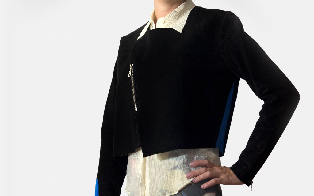 Jaqueta em camurça preta com recortes em camurça azul royal.