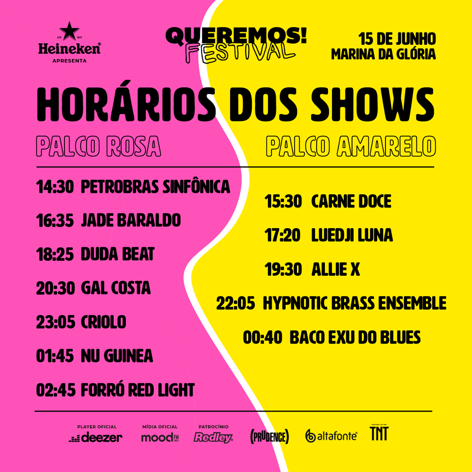 O Queremos! Festival está de volta! Depois do sucesso de público e crítica em 2018, o evento torna a convidar os apaixonados pela música a abrir a mente. O line-up celebra a diversidade musical, combinando o que há de mais quente no cenário brasileiro com uma seleção internacional que tem a curadoria do Queremos!. Os nacionais confirmados são Baco Exu do Blues, Carne Doce, Criolo, Duda Beat, Forró Red Light, Gal Costa, Luedji Luna e Jade Baraldo. A cantora Allie X, o supergrupo Hypnotic Brass Ensemble e a banda italiana Nu Guinea são as atrações estrangeiras escaladas. A abertura fica por conta da Orquestra Petrobras Sinfônica, que apresenta o projeto inédito “Petrobras Sinfônica apresenta Bohemian Rhapsody” (com o repertório do filme biográfico do Queen).