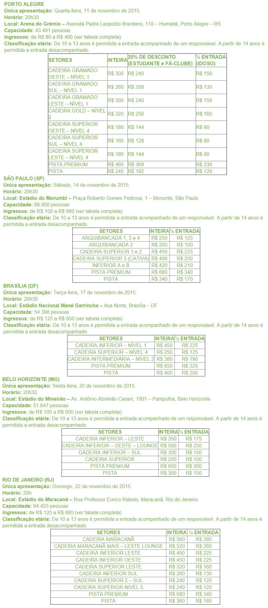 Os ingressos serão vendidos a partir de 00h01 do dia 25 de maio pela internet e a partir das dez da manhã nas bilheterias oficiais e pontos de vendas. Membros do fã-clube terão pré-venda exclusiva a partir do dia 18 de maio, também no site da Tickets For Fun: