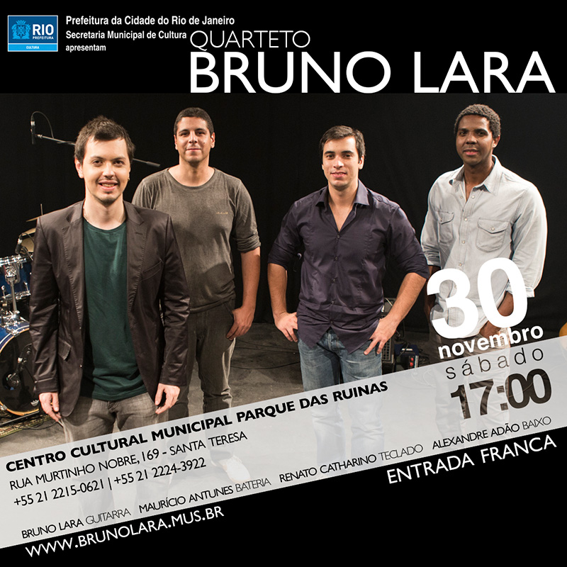 Devido ao grande sucesso de público, o Quarteto Bruno Lara volta aos palcos do Parque das Ruínas e faz mais uma apresentação grátis do CD Nix, que mistura Rock, Blues, Jazz e MPB, no dia 30 de novembro. O grupo liderado pelo guitarrista Bruno Lara traz um repertório variado e no show apresenta releituras de sucessos consagrados de Edu Lobo, Tom Jobim, Beatles, Miles Davis, Elvis Presley entre outros.