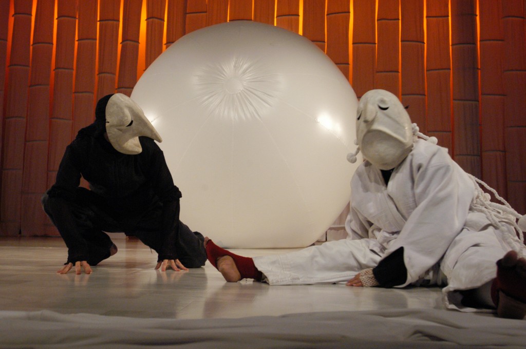“Larvárias” é inspirada na estética das máscaras do carnaval de Basel, na Suíça. As máscaras larvárias são estruturas enormes, brancas, semelhantes a uma escultura e, quando colocadas sobre o rosto, remetem imediatamente à figura humana e a um universo delicado e sutil. A utilização dessas máscaras no formato de espetáculo teatral é pioneira no Brasil.