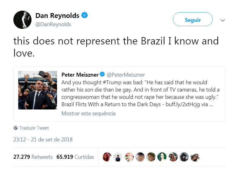 O vocalista do Imagine Dragons, Dan Reynolds, foi mais um artista que aderiu à campanha #EleNão, contra o candidato à presidência Jair Bolsonaro. O músico foi fotografado durante o festival iHeartRadio, nos últimos dias 21 e 22, vestindo a camisa com a hashtag. No mesmo dia, o cantor escreveu mensagem de apoio às manifestações em sua página pessoal.